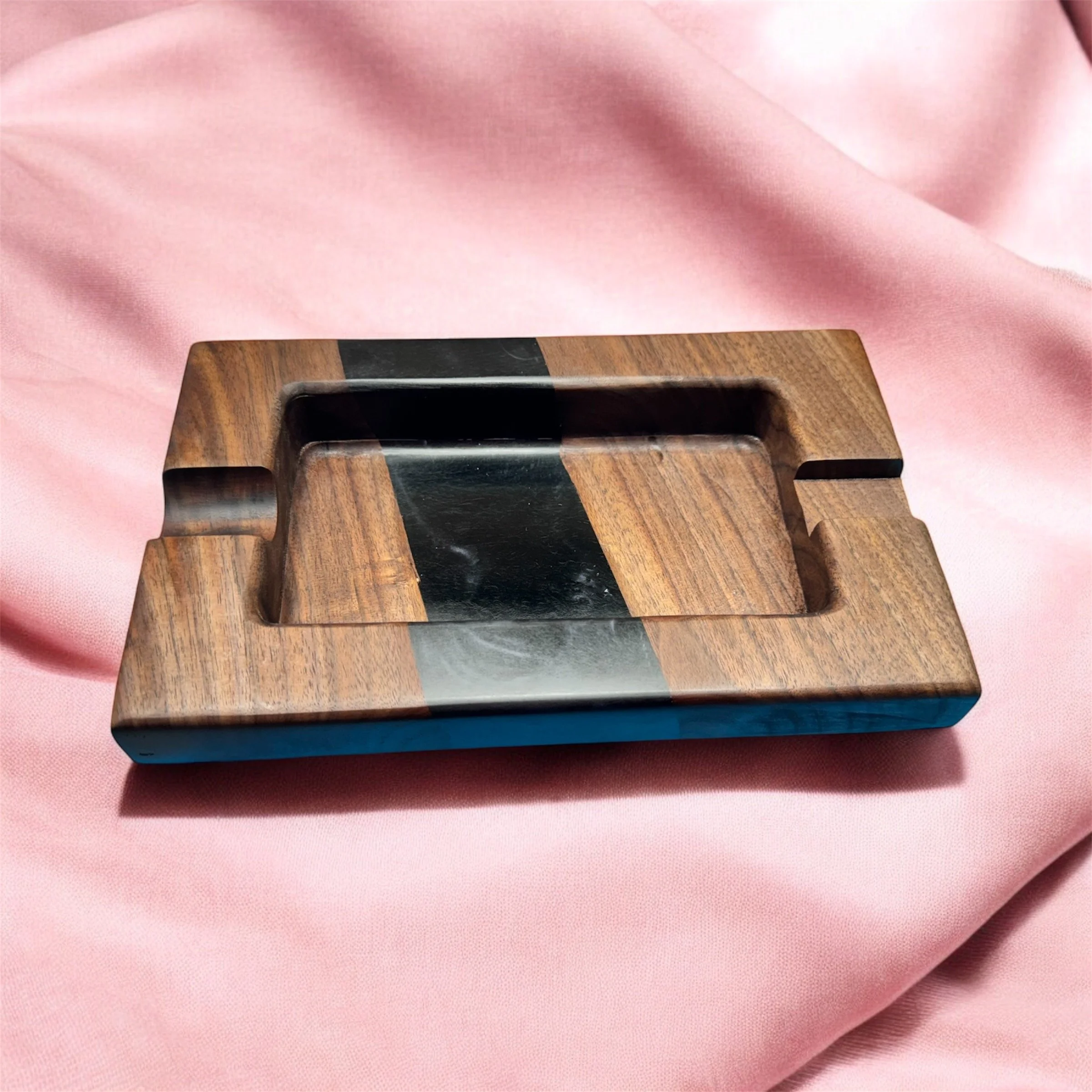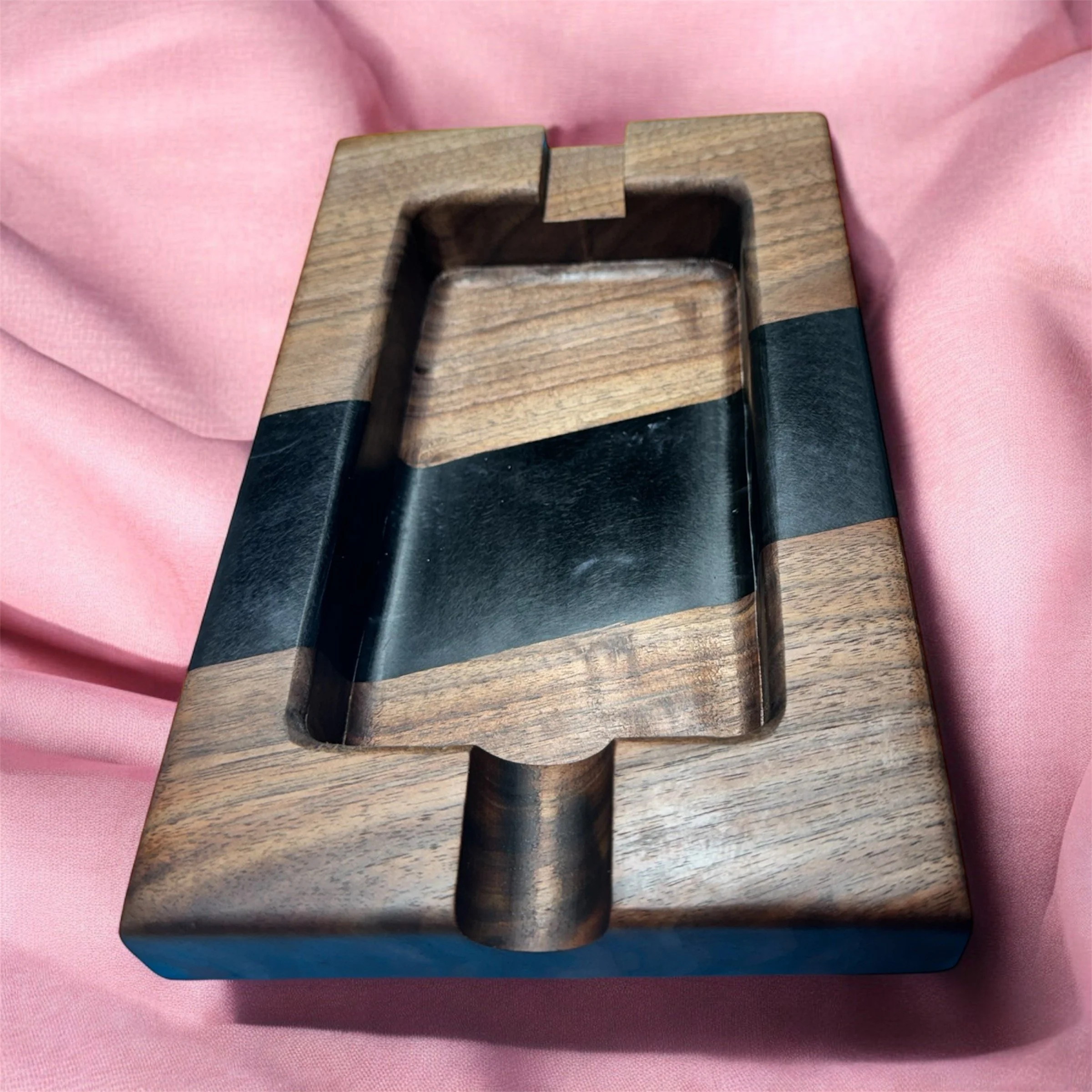 I met Steve at City Tobacco in Clinton, CT, and he was really impressed with my epoxy ashtrays. However, they were a bit too large for his needs. Steve loves to sit outside under his pergola with his favorite cigar, so he asked if I could create something more fitting. I instantly thought of a stunning piece of black walnut that I had in two sections, perfect for crafting a custom ashtray just for him. Using Super Clear Deep Pour Epoxy colored with Eye Candy Black Mica Powder, I crafted the perfect ashtray for him.
